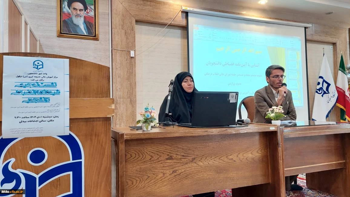 به گزارش روابط عمومی مرکز آموزش عالی خدیجه کبری (س) دزفول، ظهر روز دوشنبه 1 دی ماه ۱۴۰۴ در راستای اجرای دستور العمل معاونت امور دانشجومعلمان سازمان مرکزی در خصوص برگزاری نشست توجیهی آیین نامه شورای انضباطی، از مهدی خلفی رئیس شورای انضباطی بدوی و فاطمه السادات حسن زاده دبیر شورای انضباطی بدوی پردیس حضرت فاطمه الزهرا (س) به منظور تبیین این شیوه نامه دعوت به عمل آمد. در این برنامه که با محوریت دانشجومعلمان ورودی 1404 برگزار گردید نکات مورد نیاز دانشجومعلمان تشریح گردید و شرکت کنندگان نسبت به قوانین و مقررات آشنایی و آگاهی پیدا کردند. در پایان دانشجومعلمان سوالات خود را مطرح نمودند.