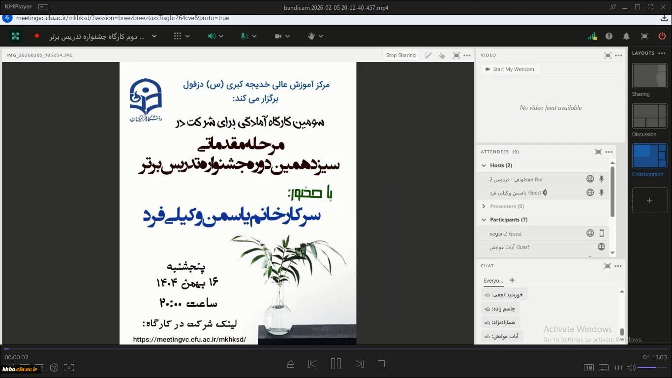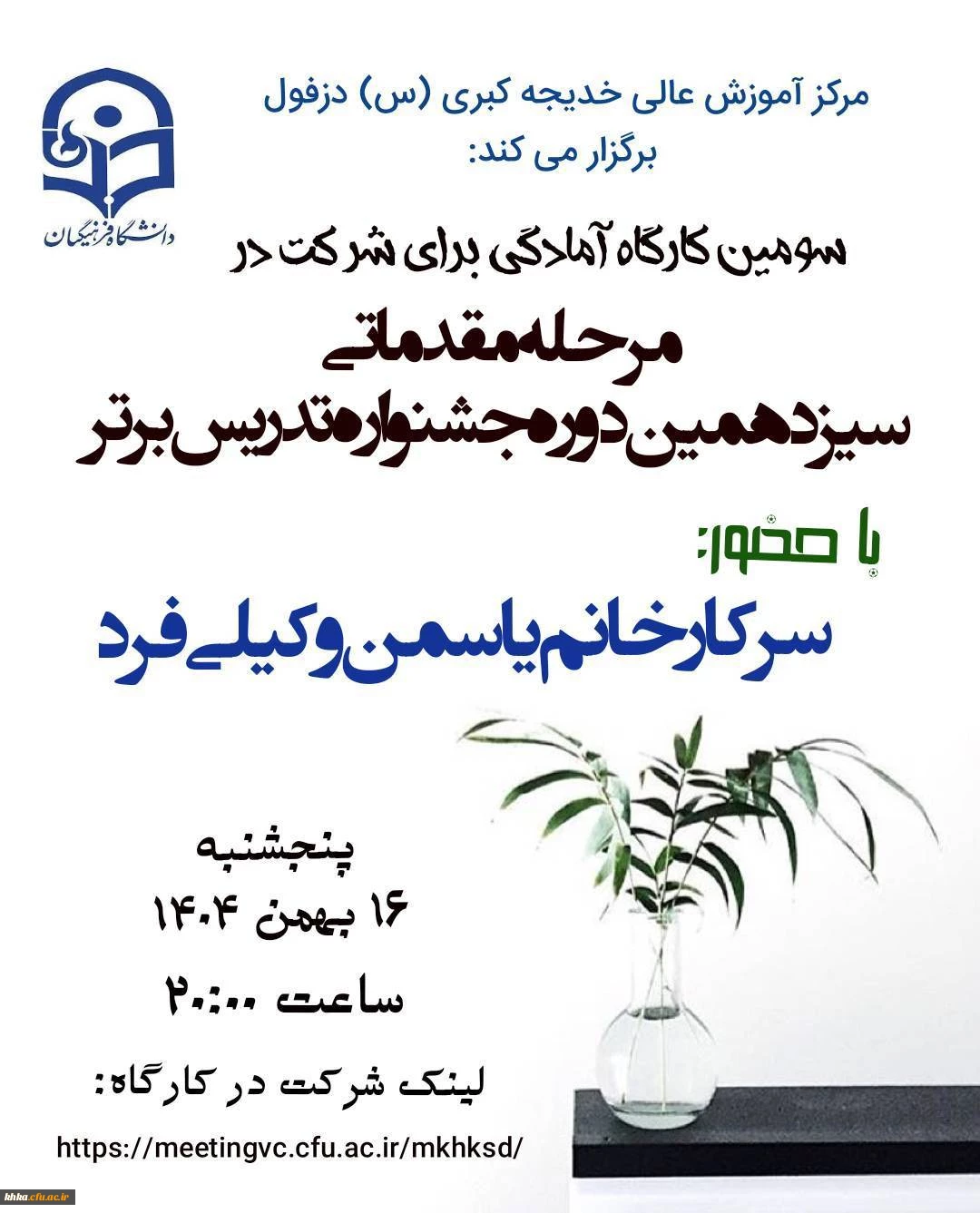 روز پنجشنبه ۱۶ بهمن ماه ۱۴۰۴ سومین کارگاه آموزشی آمادگی برای شرکت در جشنواره تدریس برای دانشجویان علاقه مند به شرکت در سیزدهمین دوره جشنواره تدریس مرکز آموزش عالی حضرت خدیجه کبری (س) دزفول برگزار شد.