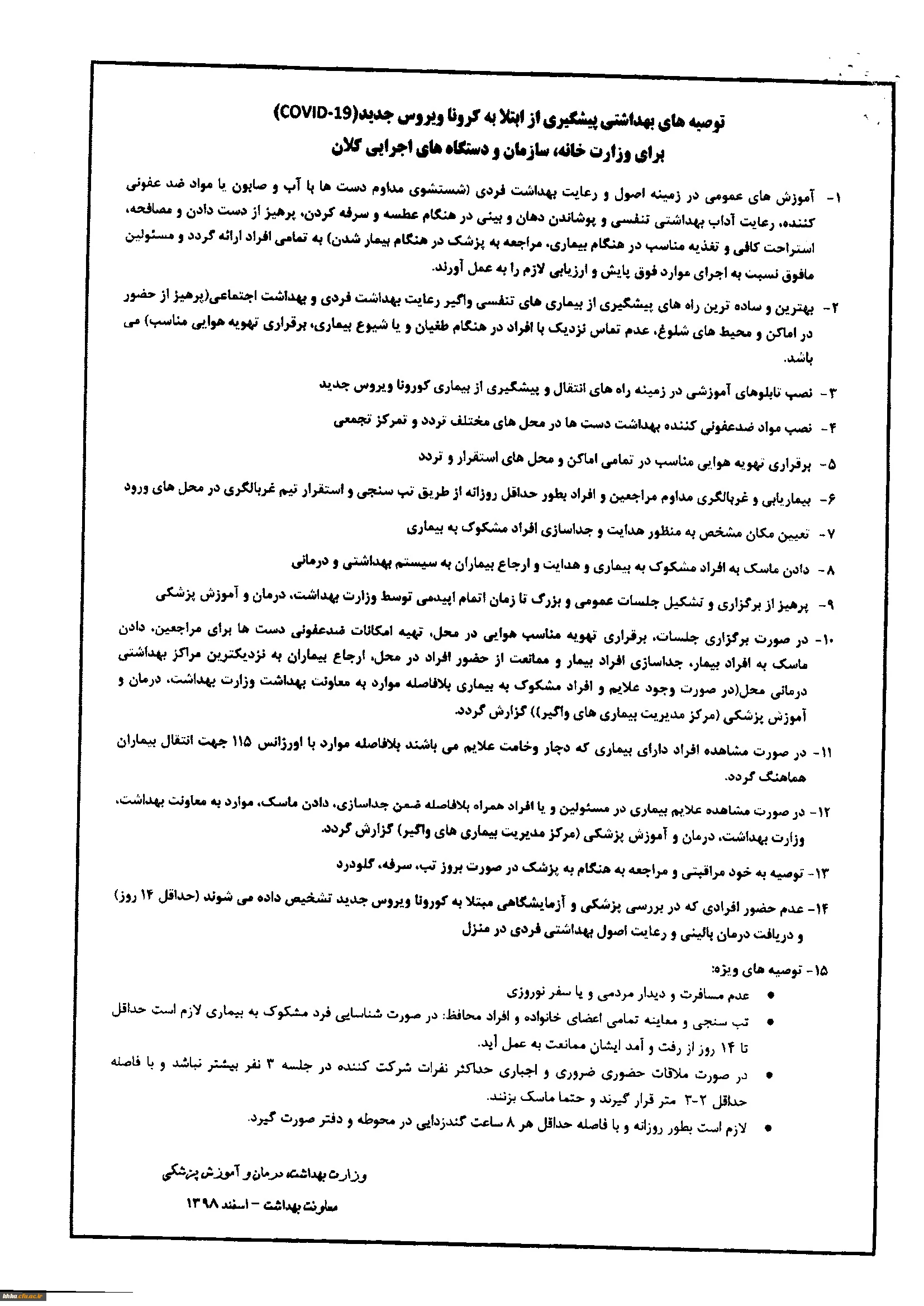 امتیاز دهید : آخرین توصیه های بهداشتی پیشگیری از ابتلا به بیماری کرونا ویروس جدید 2 چهارشنبه 21 اسفند 1398 ساعت 12:55
