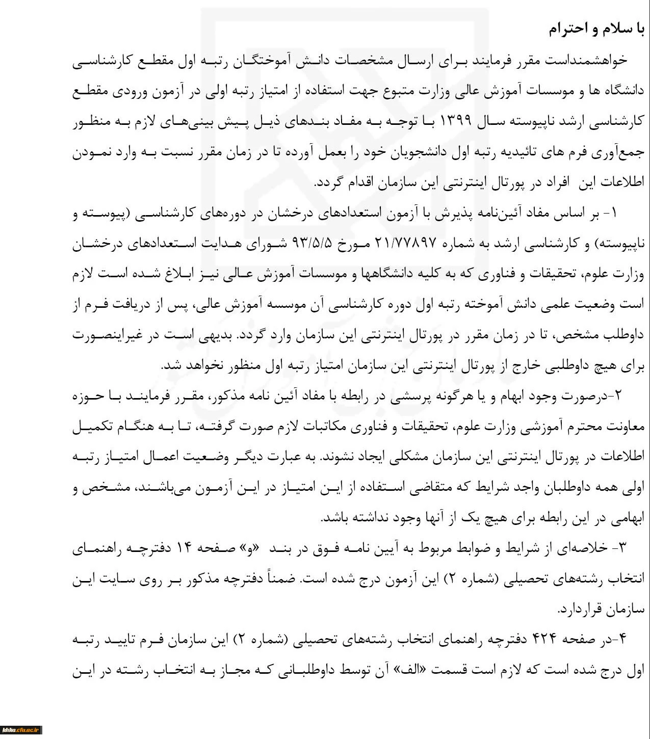 بخشنامه دانش اموختگان رتبه اول کارشناسی برای شرکت در ازمون ورودی مقطع کارشناسی ارشد ناپیوسته سال ۹۹ 2