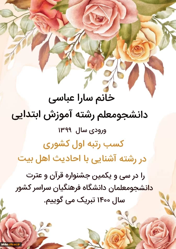 امتیاز دهید : کسب رتبه اول کشوری رشته آشنایی با احادیث اهل بیت توسط خانم سارا عباسی 2 شنبه 15 آبان 1400 ساعت 18:54