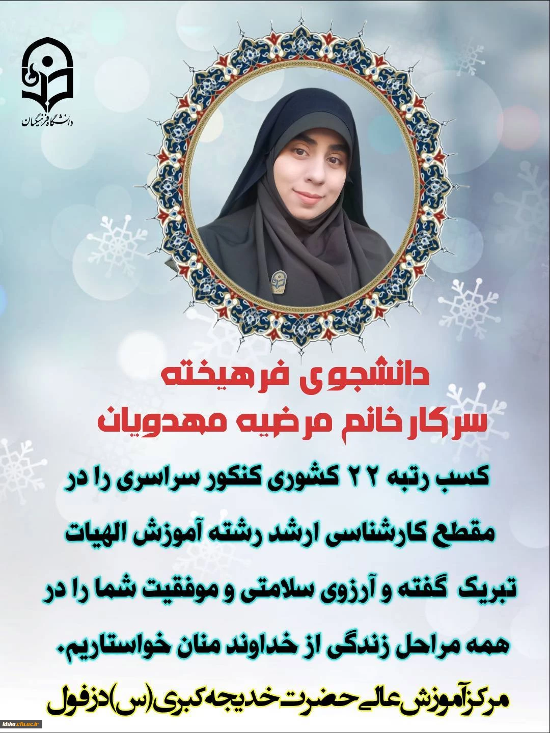کسب رتبه ۲۲ کشوری کنکور سراسری را در مقطع کارشناسی ارشد رشته آموزش الهیات توسط دانشجو معلم فرهیخته سرکار خانم مرضیه مهدویان 2