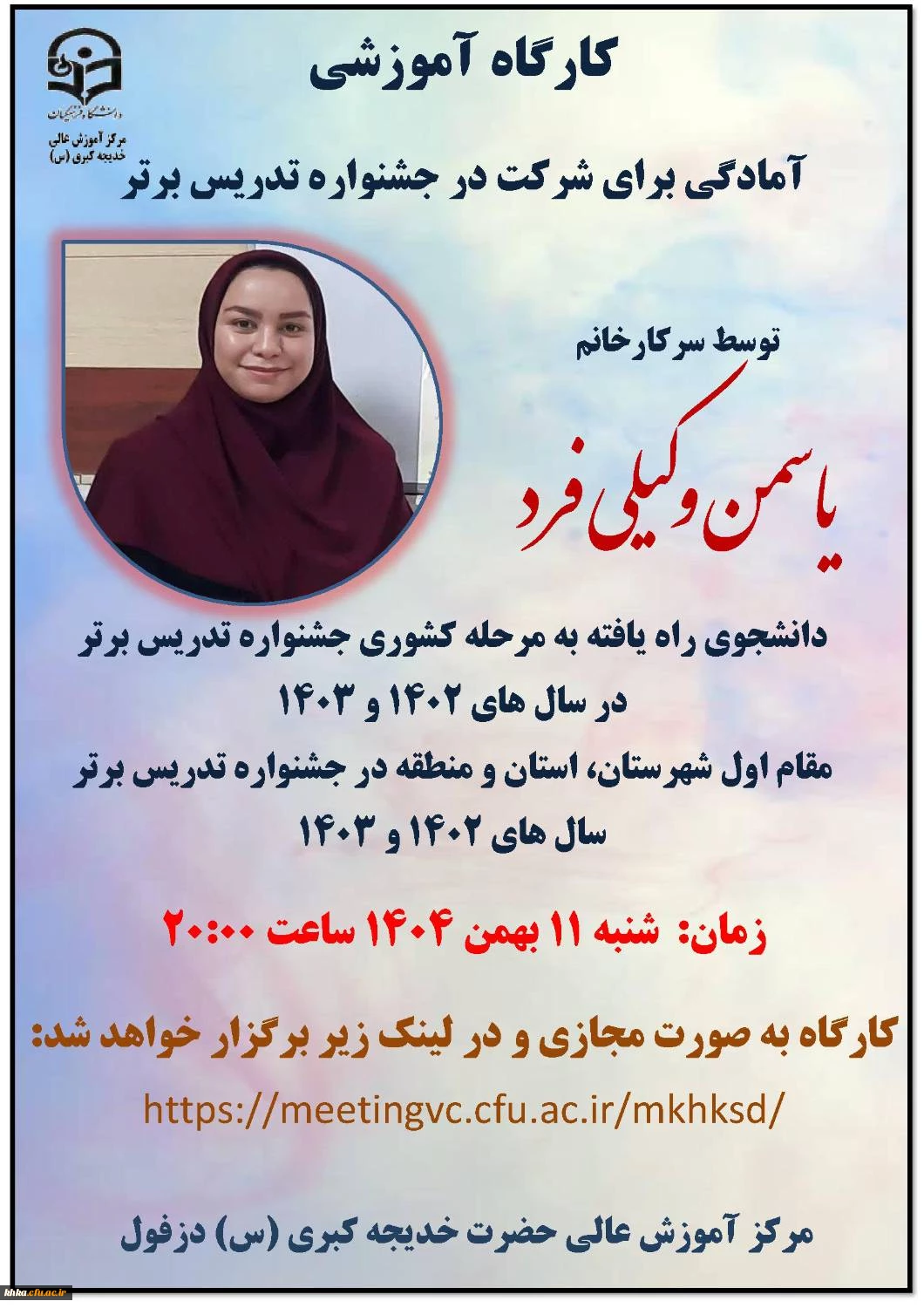 امتیاز دهید : برگزاری اولین کارگاه آموزشی آمادگی برای شرکت در جشنواره تدریس 3 دوشنبه 13 بهمن 1404 ساعت 8:27